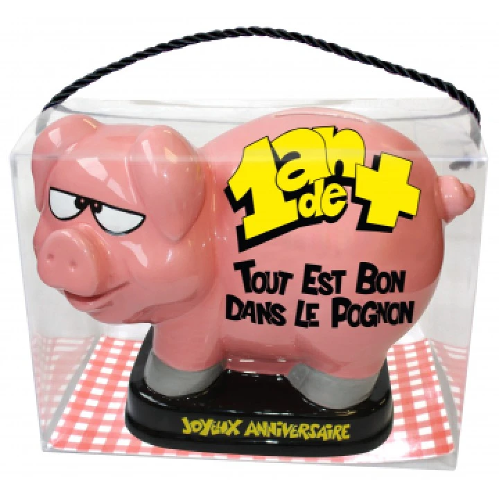 Vous voulez faire un cadeau d’anniversaire humoristique , cette tirelire cochon 1 an de plus est exactement ce qu’il vous faut. Cette tirelire cochon est un petit cochon rose au regard malicieux posé sur un support noir sur lequel est inscrit en gros caractères jaunes 1 An de + et en-dessous en noir